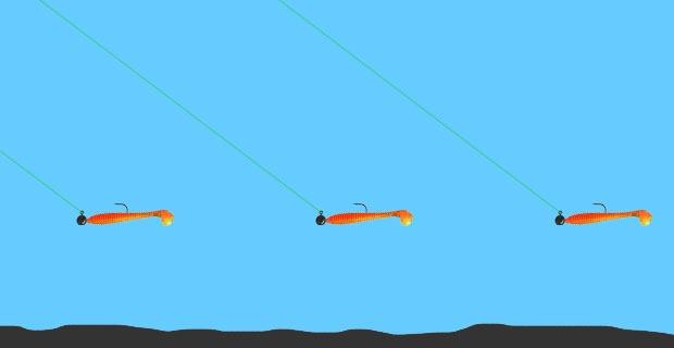 поводка длиной 40-70 см с привязанным на его конце офсетным крючком и твистером или виброхвостом. Другой конец поводка привязан к простому вертлюжку на конце основной лески или шнура, за которым на леске располагается крупная стопорная бусина и конический скользящий грузик («пуля») весом 10-12 г.