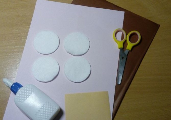 Берёте картон либо плотную бумагу (например, желтого или белого цвета). Вырезайте из неё круглые заготовки глаз. Затем приклеивайте на них круглые зрачки из чёрной бумаги. Глаза готовы!