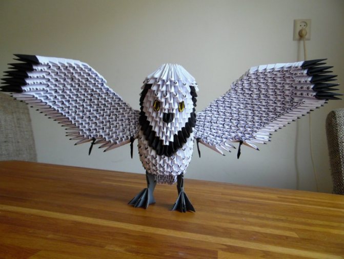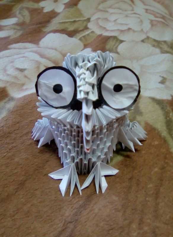 Техника модульного оригами предполагает создание разнообразных фигур путем складывания модулей, т.е. маленьких элементов из бумаги. В некоторых случаях их количество может составлять сотни, а то и тысячи мелких деталей, особенно для поделок в формате 3D. На фото отлично видно, из каких элементов состоит сова оригами.