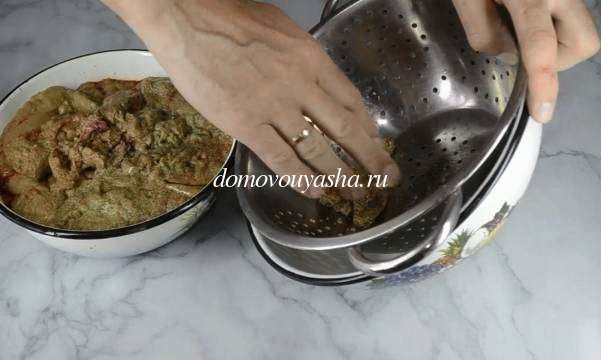 Теперь можно ждать когда вода стечет из икры, или помочь ей стечь. Для этого взять за края марли, собрать её в одну руку и круговыми движениями сдавливать икру. Если кто не понял, как это, то в конце статьи есть видео ролик, в котором видно, как это делаю я.